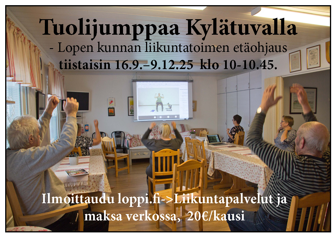 • Etätuolijumppa-ryhmä Kylätuvalla alkaa ti 16.9., jatkuen viikottain 9.12. saakka klo 10-10.45. Seurataan Lopen kunnan liikuntatoimen senioriväelle suunnattua ohjausta. Tule mukaan, kausi 20€.