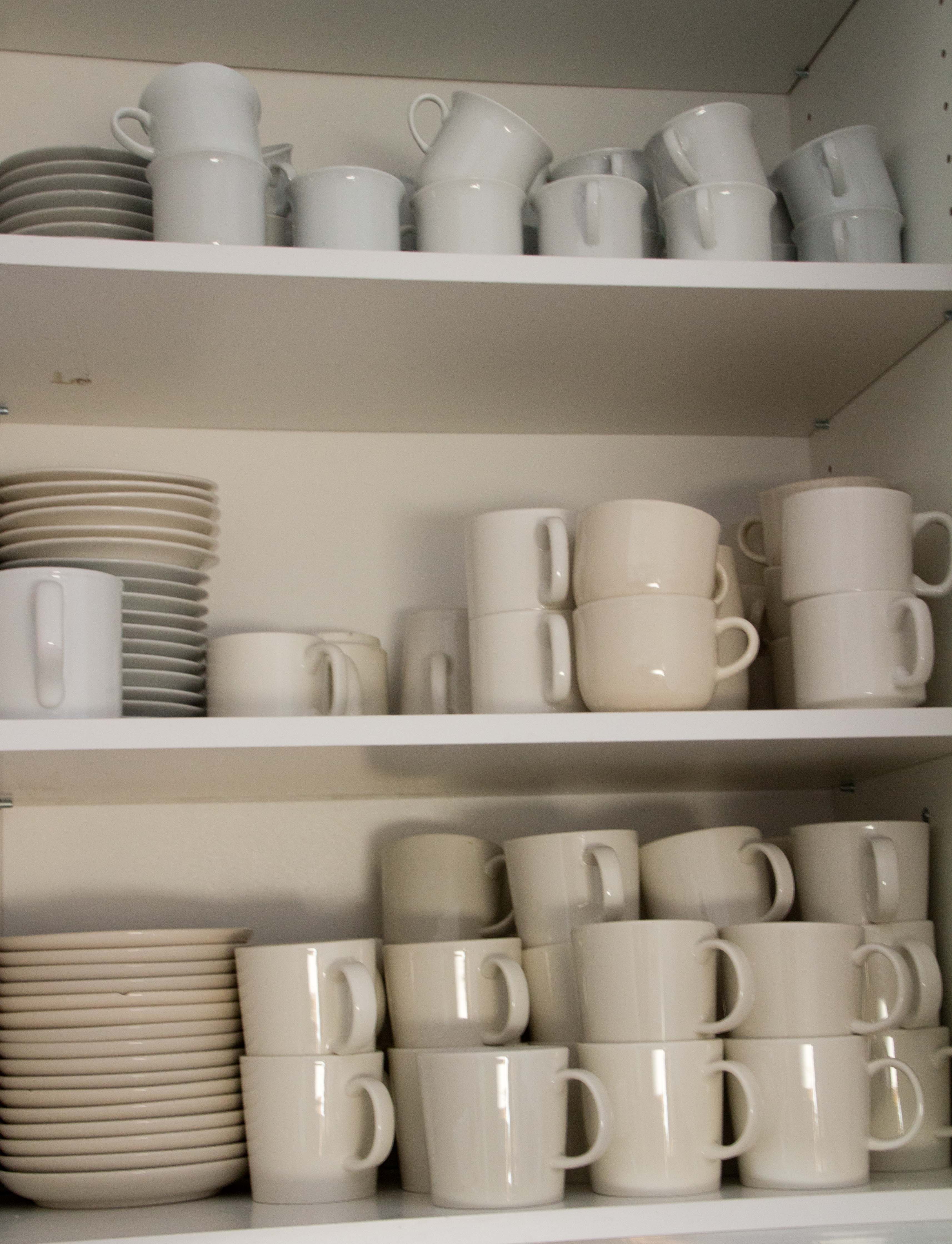 Kahvikuppeja ja mukeja riittää isommallekin joukolle. Lisäksi on lasiasetteja.