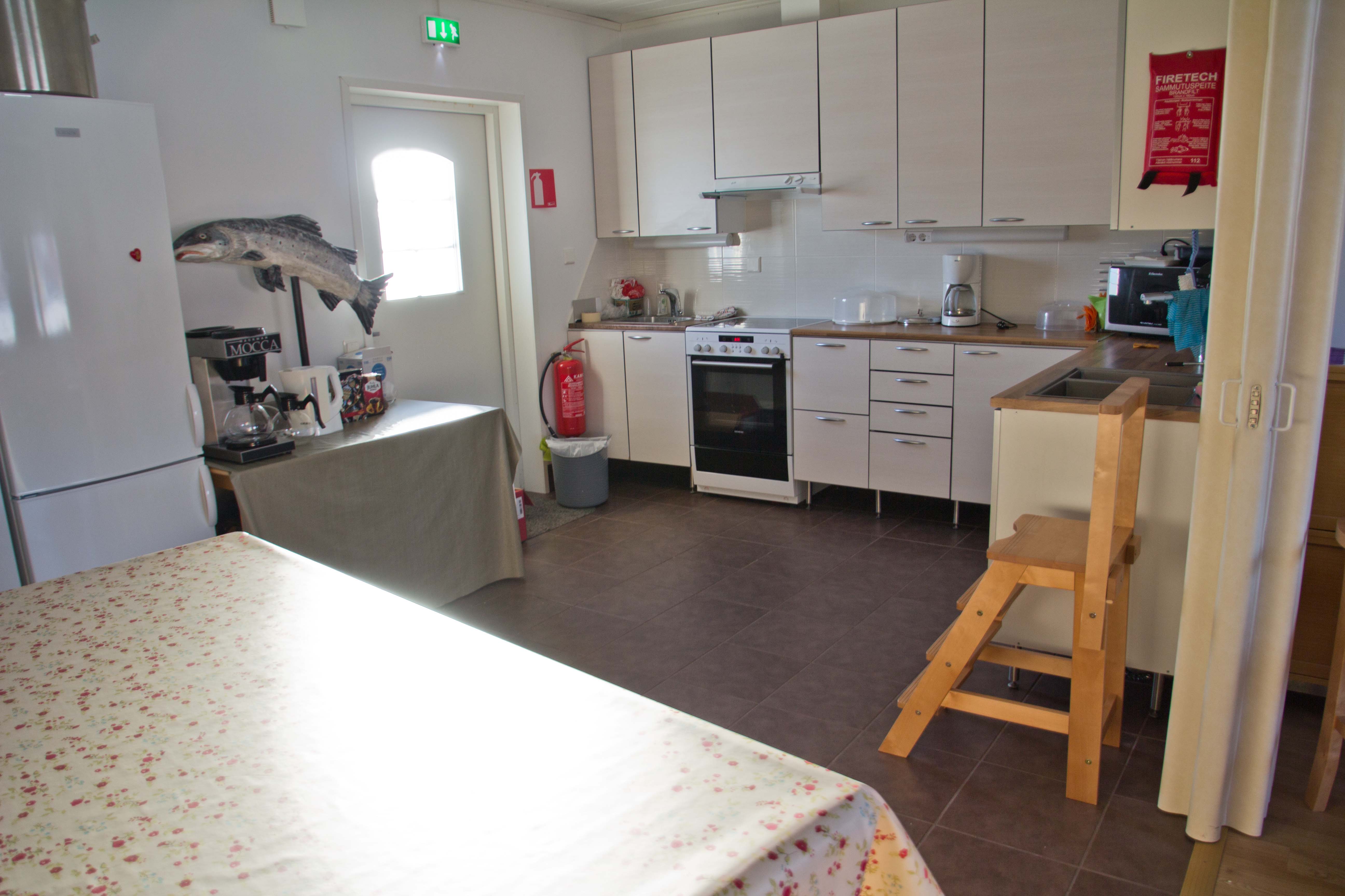 Varustukseen kuuluu täyskorkea jääkaappi ja jääkaappi-pakastin, keittimiä, käsienpesupiste, keraaminen liesi (ei induktio) ja uuni, mikroaaltouuni, astianpesukone ja tiskipöytä sekä ruoanvalmistusvälineet, kattilat ja pannut. Suurin kattila on 30 litraa.