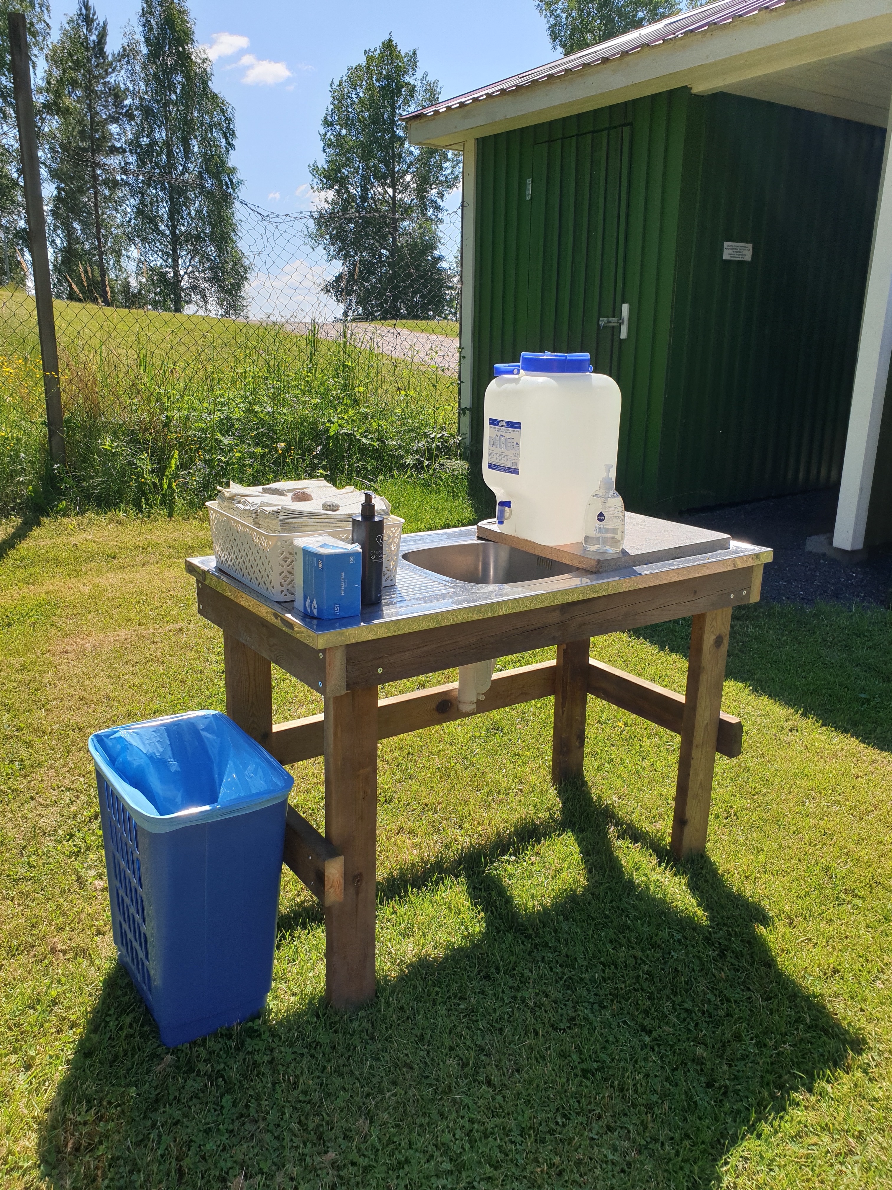 Liikuteltava käsienpesuallas on osoittatunut toimivaksi. Lämmin pesuvesi on noudettavissa kanisteriin kylätuvalta. Pesupiste voidaan sijoitaa heti sisäänkäynnin yhteyteen tai ämpärillä varustettuna myös sisääntuloterassille.