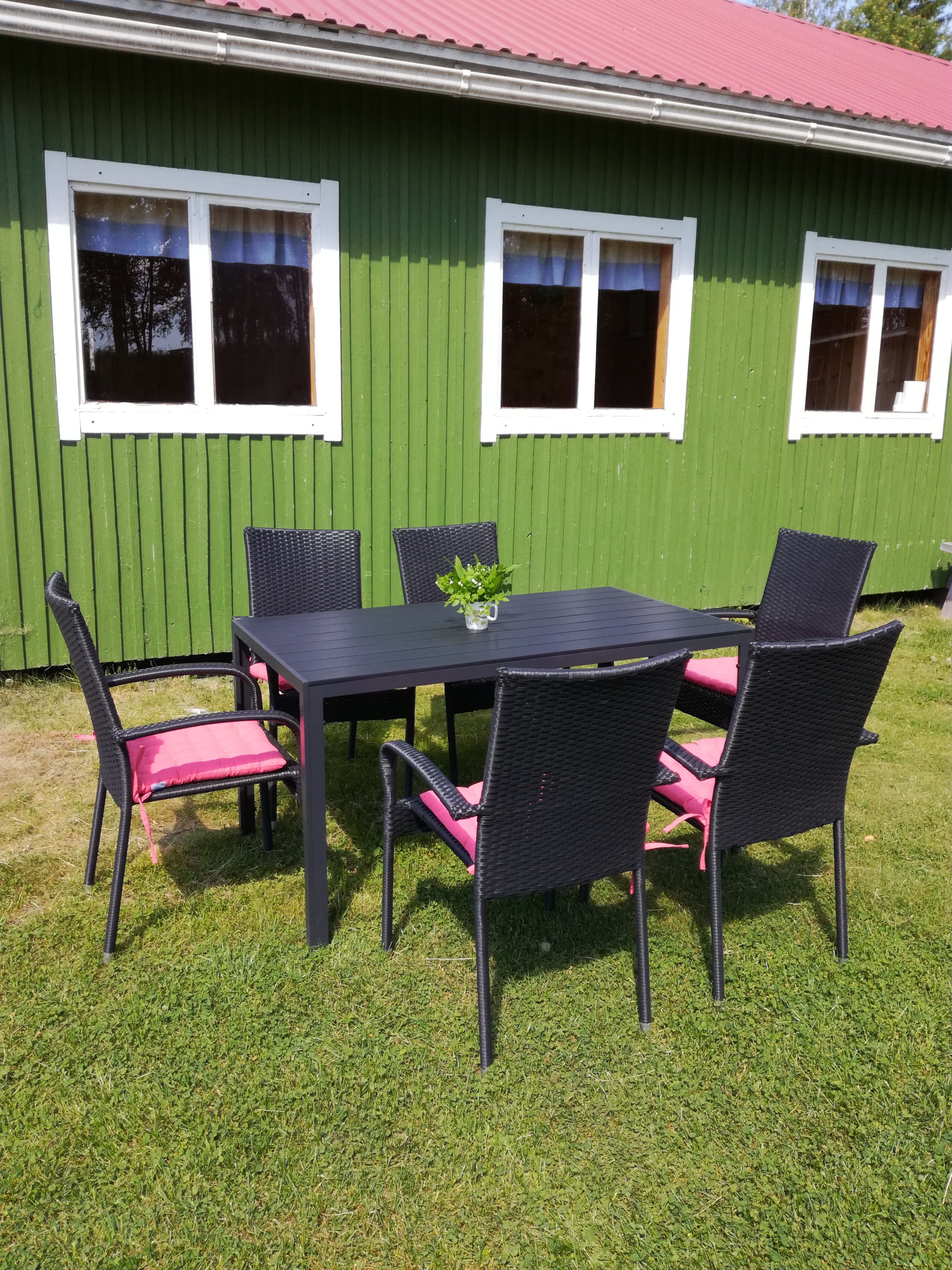 Varustukseen kuuluu kaksi kevyttä siirrettävää ulkopöytää ja näihin kumpaankin kuusi selkänojallista tuolia. Lisäksi käytettävissä on pari raskastekoista ulkopöytäryhmää grilliteltan yhteydessä.